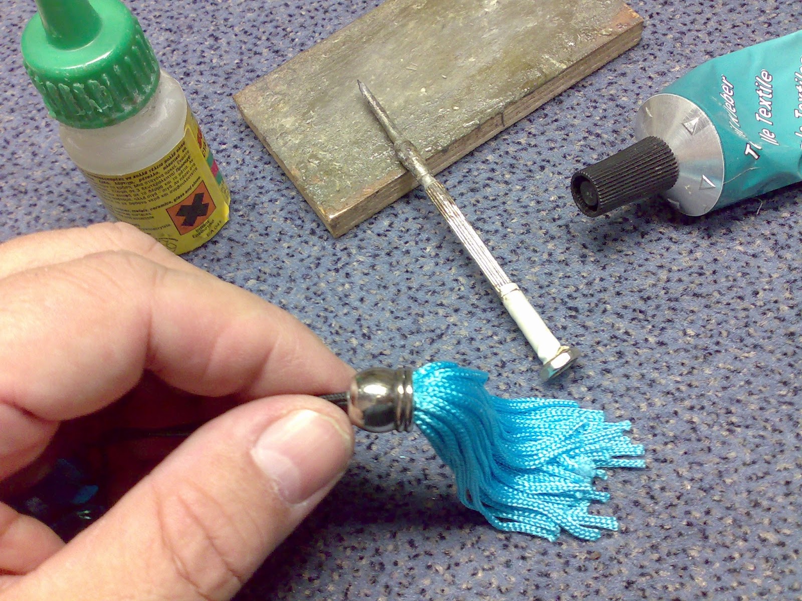 Βρηκα μια μπλε χαντρα,της ανοιξα την οπη και κολλησα το τρυπανακι με εποξικη.